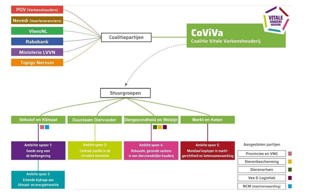 Coviva is een samenwerkingsverband tussen POV, Rabobank, Nevedi, Topigs-Norsvin, VleesNL en het ministerie van LVVN. Het (technisch) voorzitterschap zal vanaf dit jaar rouleren tussen de betrokken organisaties.