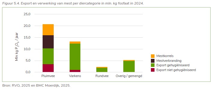 Figuur 5.4 uit het rapport laat zien dat het grootste deel van de geëxporteerde en verwerkte mest uit pluimveemest bestaat. In de praktijk is het zo dat nagenoeg alle pluimveemest die in Nederland is geproduceerd (20,8 mln. kg fosfaat in 2024) wordt geëxporteerd of verwerkt (20,7 mln. kg fosfaat in 2024). In 2024 werd circa 13,2 mln. kg fosfaat varkensmest en 2,1 mln. kg fosfaat rundveemest verwerkt en/of geëxporteerd. Dit komt overeen met 41% van de in 2024 geproduceerde varkensmest en 2% van de geproduceerde rundveemest.